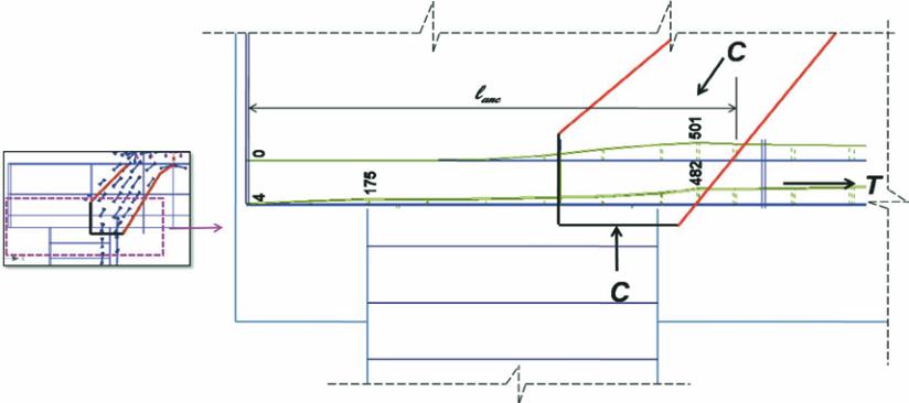 Figura 17 – Comprimento de ancoragem e tensões atuantes (em MPa) nos tirantes na região